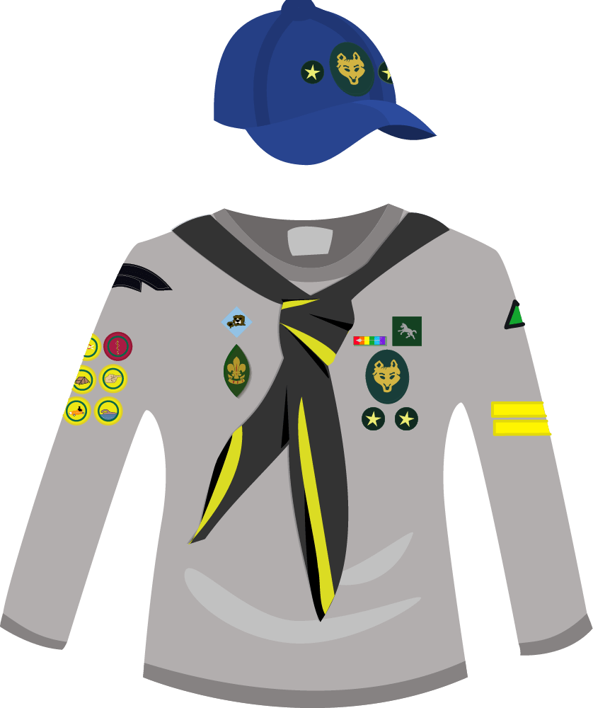 The Timberwolf uniform is a gray tee-shirt, either short or long sleeves, with the group necker and a blue baseball cap. The Tenderpad badge, earned by learning the basics of being a Timberwolf, is placed on the left side under the Inclusivity badge. On the right is the WFIS badge.
